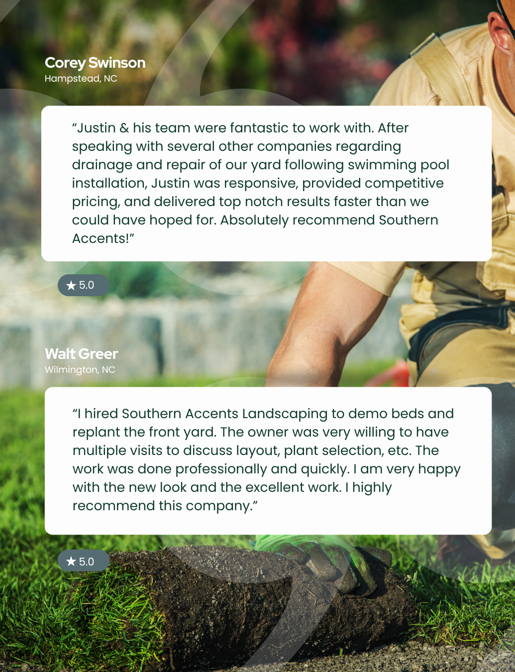 Southern Accents Landscaping proudly serves families and businesses throughout Wilmington, Leland, Wrightsville Beach, Hampstead, and the surrounding coastal areas. Our highly experienced team specializes in landscape design and installation, including paver patios and walkways, retaining walls, sod and turf, drainage solutions, and planting.